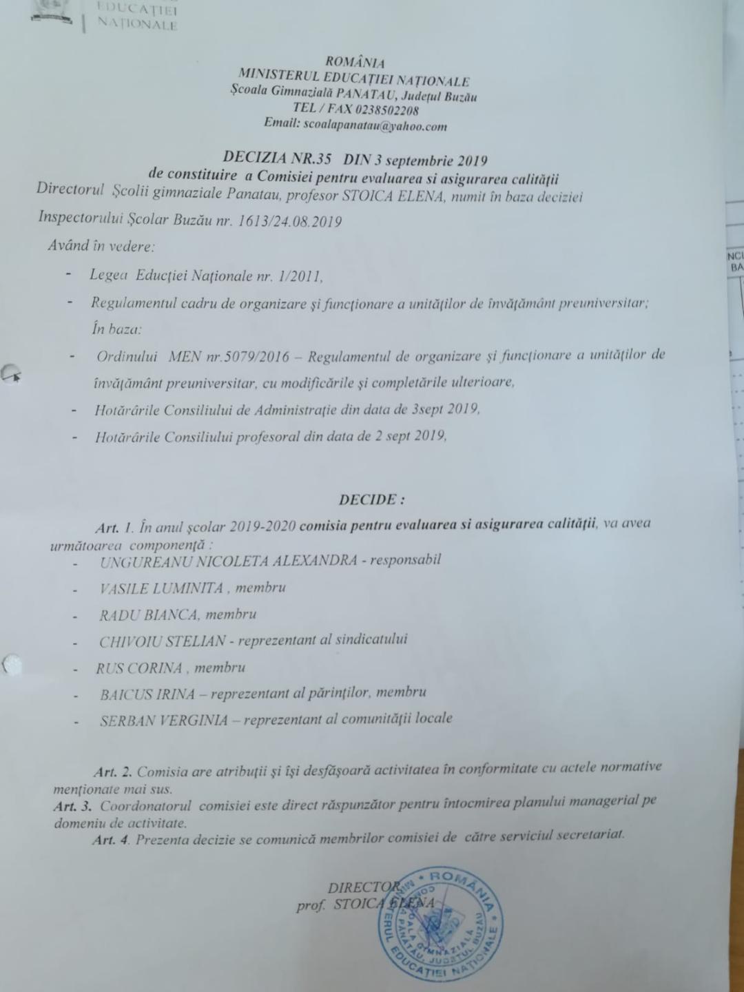 - DECIZIA NR.35 DE CONSTITUIRE A COMISIEI PENTRU EVALUAREA SI ASIGURAREA CALITATII